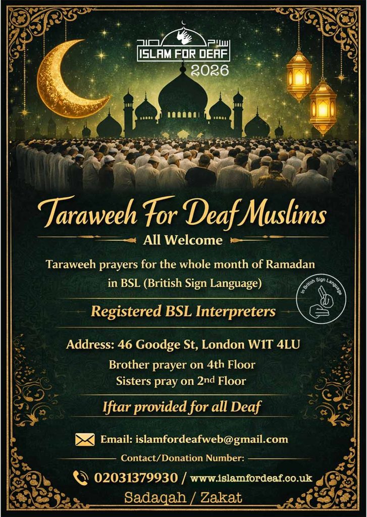 Islam for Deaf performed for first Taraweeh for the Deaf Community During Ramadan 2017 which was held at London Central Mosque. With the permission of Allah and generous Donations the task was a success. By the permission and grace of Allah we plan to keep providing Taraweeh for the Deaf Community every year insha Allah, in different cities throughout the UK. Your generous donations help Islam for Deaf provide Islamic materials and services for the Deaf Community, so please support and continue to donate as we are still in need of continuing the call to islam in BSL (British Sign Language).